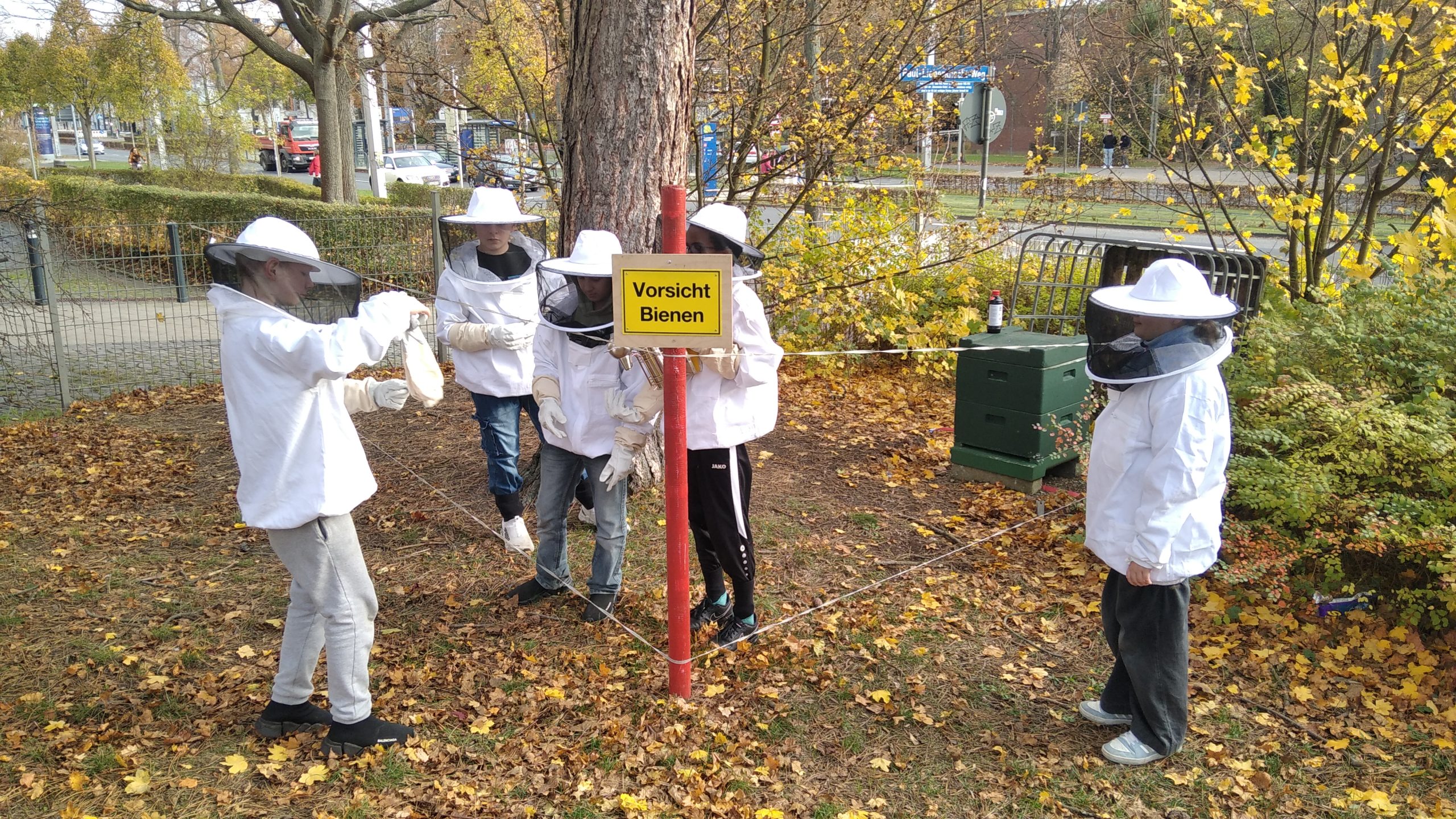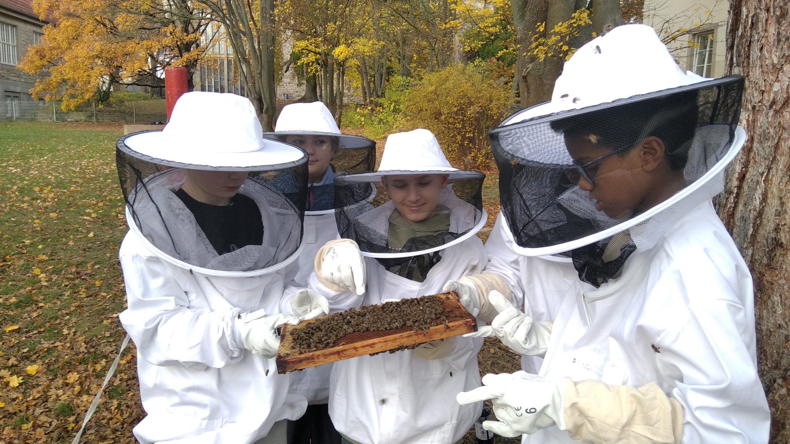 Seit Oktober summt es an der Luisenschule – ein Bienenvolk ist endlich auf dem Schulgelände angekommen. Es steht in Richtung Schulamt und Wilhelmshöher Allee auf der großen Wiese. Die Bienen-AG unter der Leitung von Jochen Feuring ist erfolgreich gestartet. 8 junge Nachwuchsimkerinnen und -imker wollen in diesem Schuljahr den sachgerechten Umgang mit den fleißigen Insekten erleben und erlernen – toll!