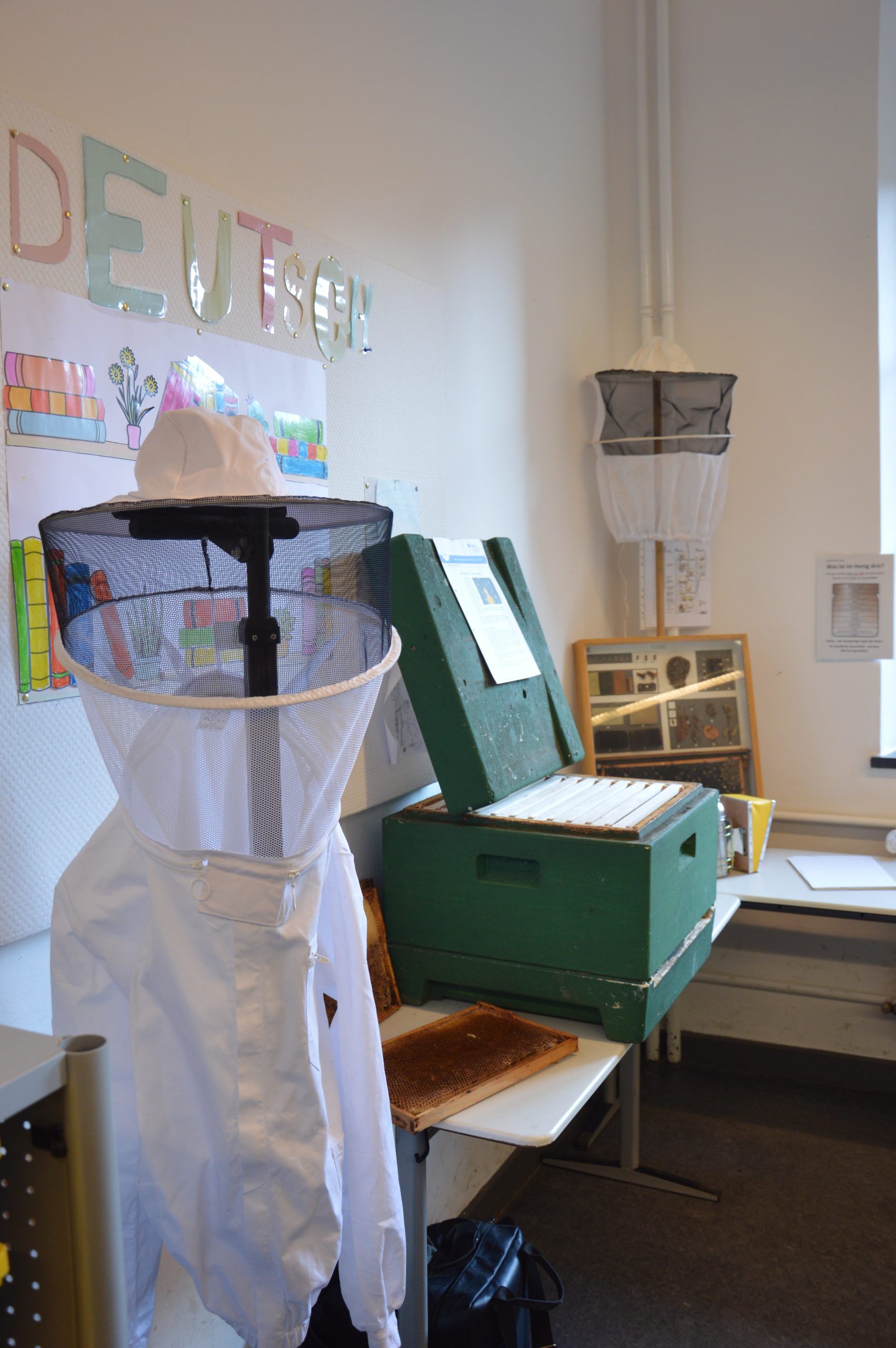 Herr Feuring hat seit 15 Jahren Bienenerfahrung, ist Hobby-Imker in Trendelburg. Eines seiner Völker ist nun leihweise der Schule zur Verfügung gestellt worden. Sofern alles klappt und fortgeführt wird, wird es von der Schule übernommen – so der Plan. Darüber hinaus wurde ein Grundsortiment an Werkzeug und Material bereits über die Luisenschule angeschafft, u. a. acht Imkeranzüge mit Schleier.